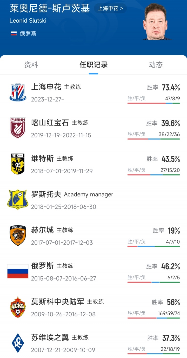 斯卢茨基自2023年12月出任申花俱乐部主教练以来,至今共率队出战正式比赛64场,其中亚冠精英联赛10场(4胜1平5负)、中超联赛46场(36胜7平3负)、中国足协杯6场(5胜1负),中国超级杯2场(2胜)。其丰富的执教经验和鲜明的战术风格深得俱乐部、业界和球迷的广泛认可。期待在斯卢茨基先生的带领下,申花队能够朝着更高的目标稳步迈进。 ​